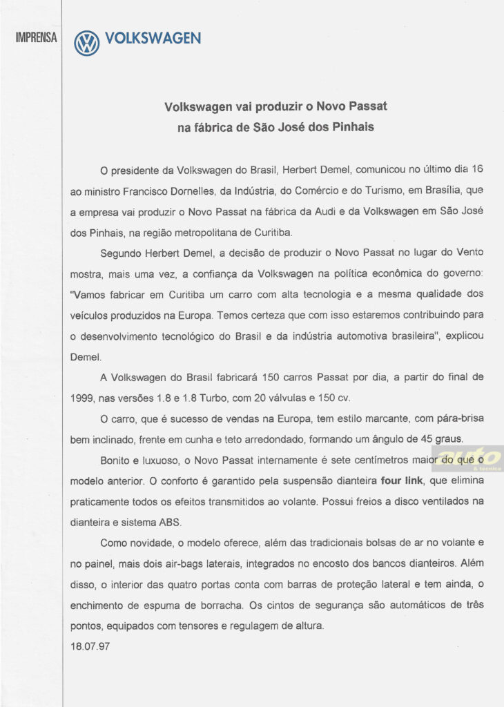Curiosidade: nos arquivos de A&T, além das fotos oficiais da VW (abaixo) localizamos um press release da marca anunciando que Herbert Demel, então chefão da empresa, havia comunicado a um ministro do governo que o “Novo Passat” seria produzido na fábrica paranaense da VW: “150 carros Passat por dia, a partir do final de 1999”. Não aconteceu…