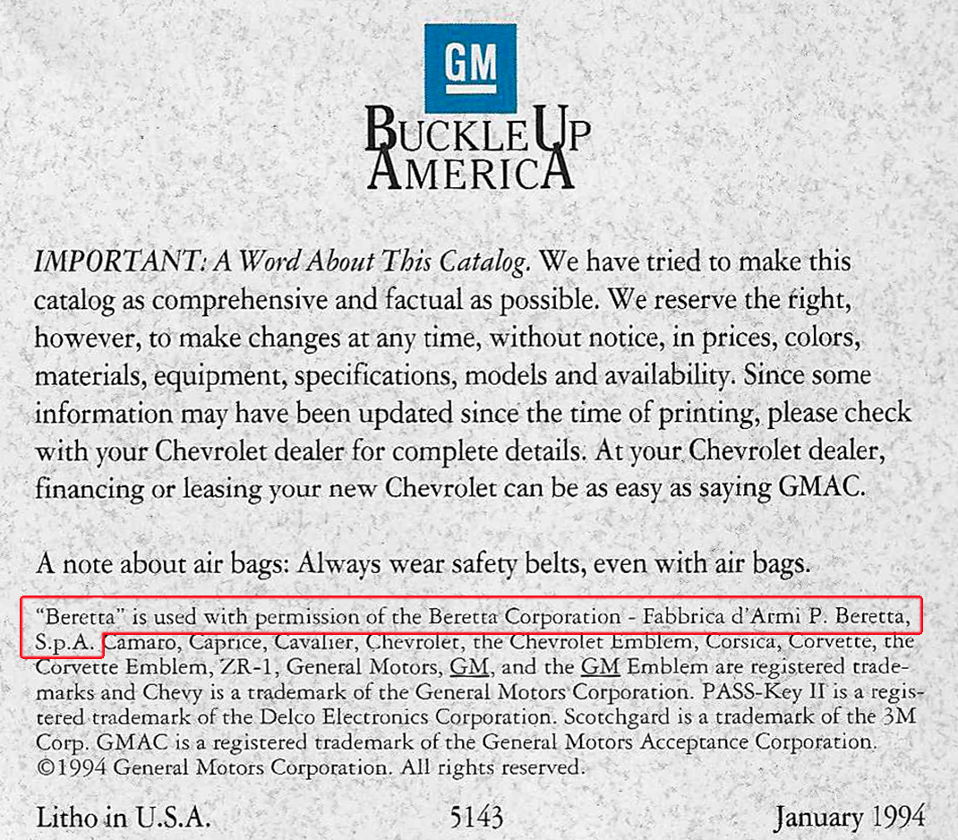 Mas sem dúvida o episódio mais curioso de sua história foi o processo judicial movido pela fabricante italiana de armas Beretta (Fábrica d’Armi Pietro Beretta) pelo uso do nome, resolvido com um acordo amigável, o que obrigou a GM a destacar que o nome era usado sob licença.