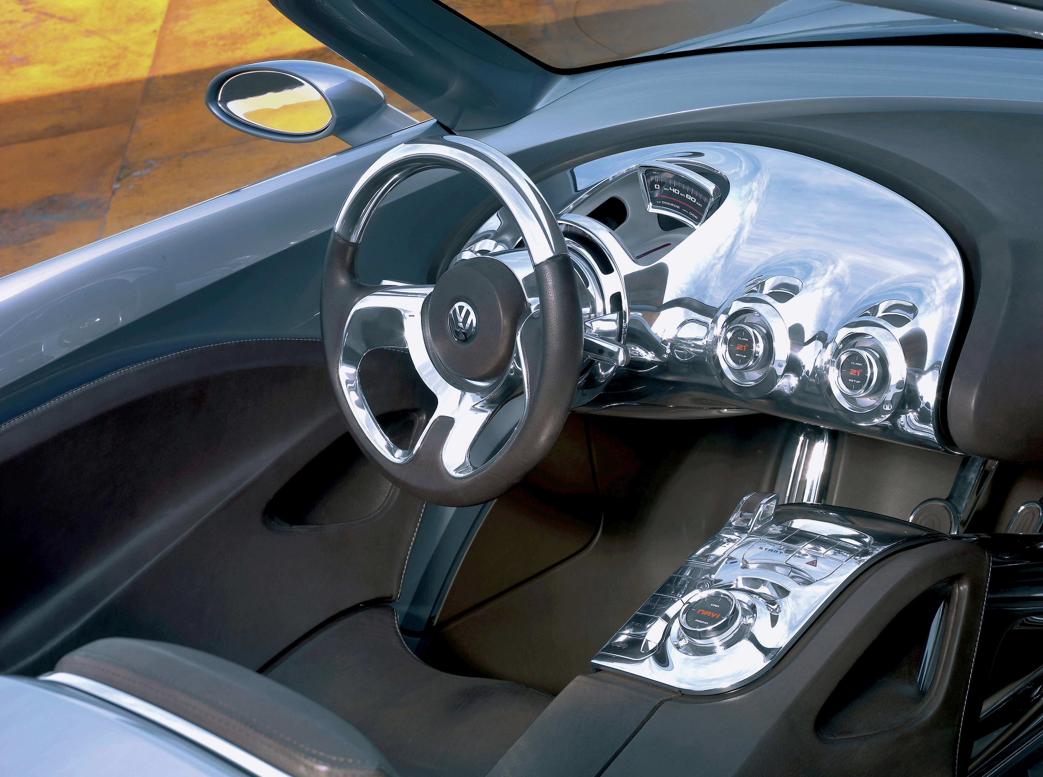 Todas as áreas envolvendo elementos de comando e mostradores, além de detalhes do volante (com climatização própria) eram de alumínio polido. Mais retrô impossível!