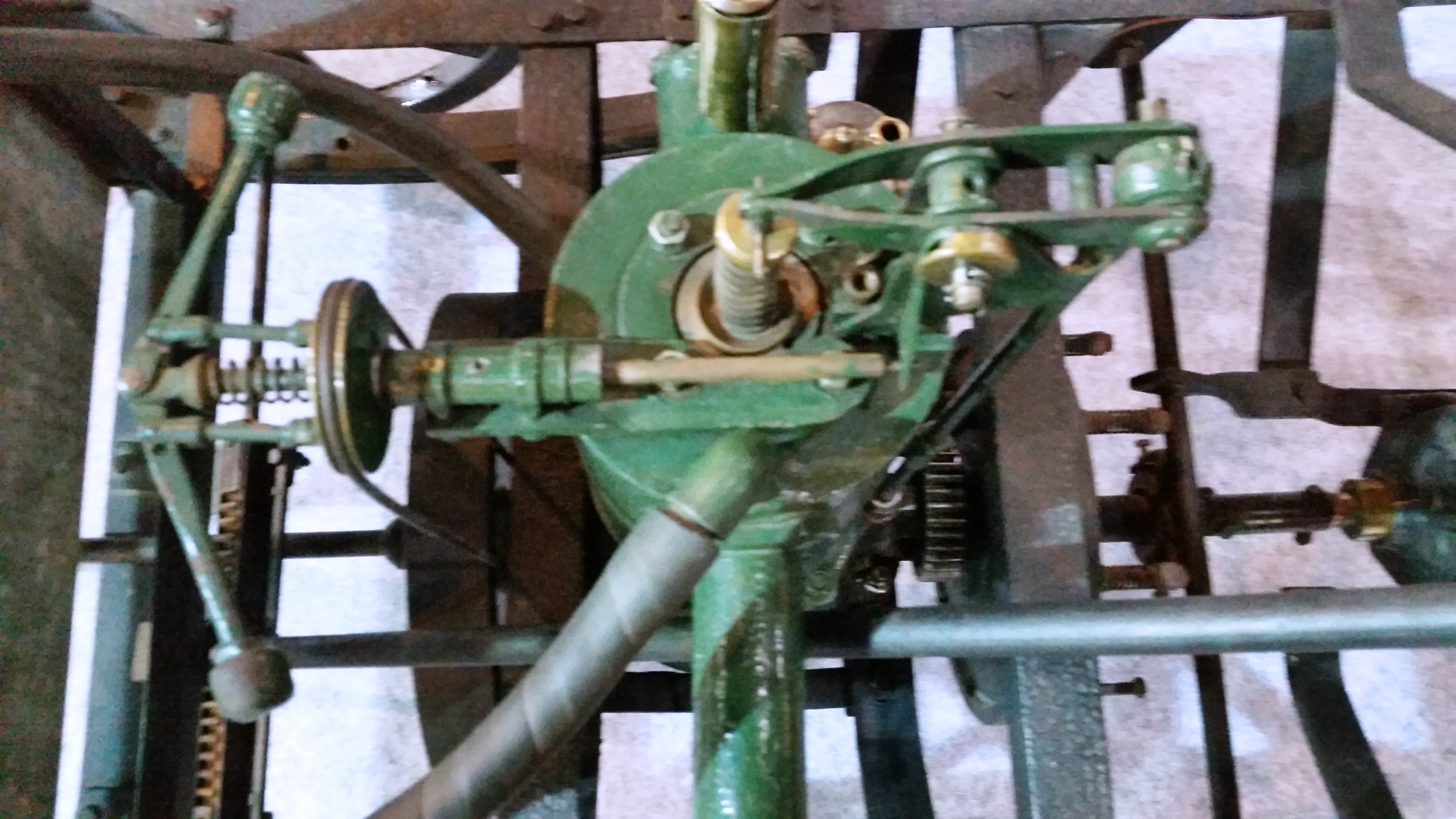 Motor. Peça preciosa, avançada em relação a outras tentativas pioneiras. Vertical, longitudinal, monocilíndrico cego. O bloco integra o cabeçote, dividido em duas partes: na câmara de combustão passa a válvula de escapamento, acionada externamente. Na parte anterior, alojando a válvula de admissão, há interessantíssima pré-câmara, para receber a mistura criada pelo carburador. A pré-câmara possui um duto afunilado e, desta maneira, cria velocidade e turbulência na mistura enviada à combustão. É solução empregada atualmente. Virabrequim feito em torno, biela e pistão fundidos em ferro.