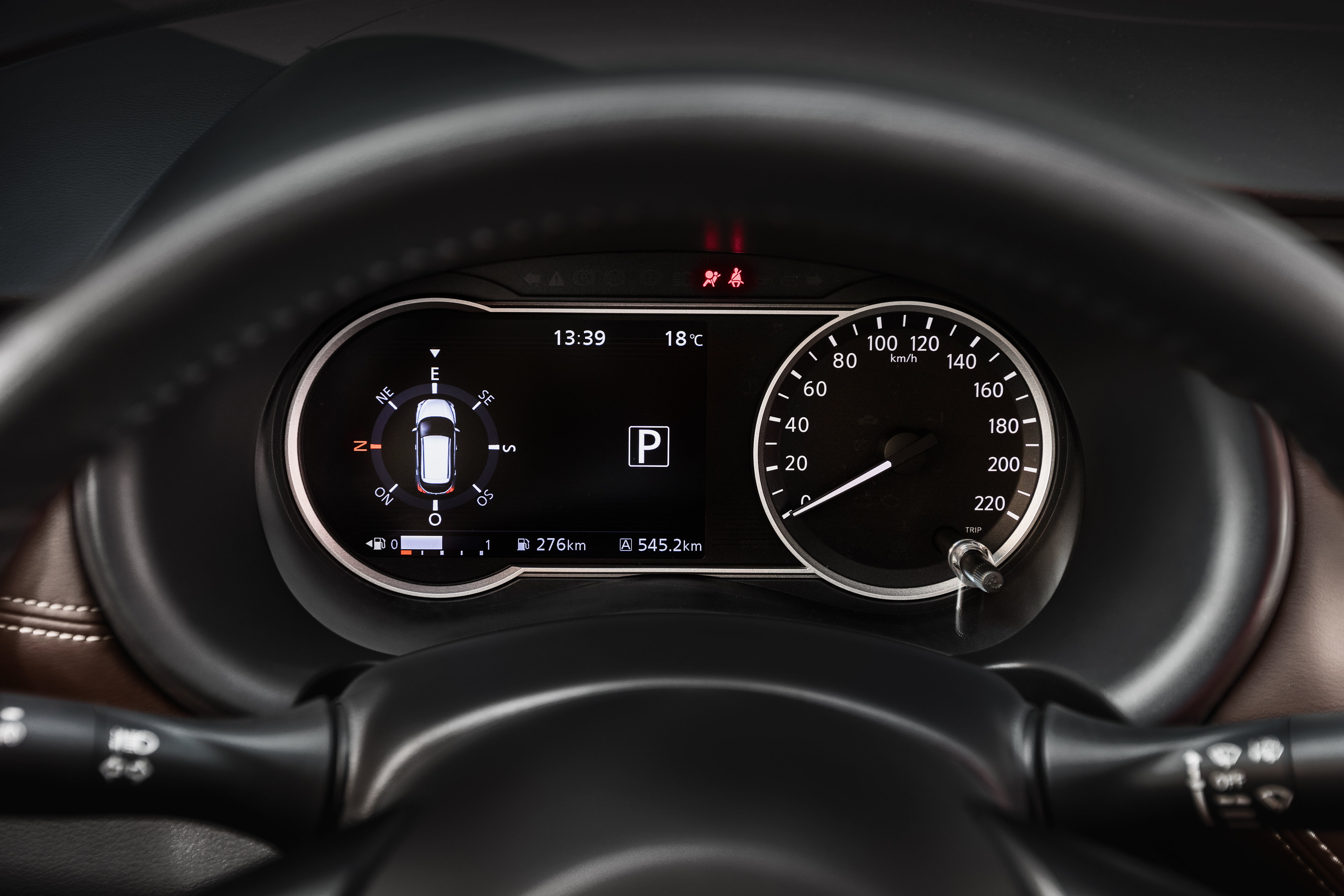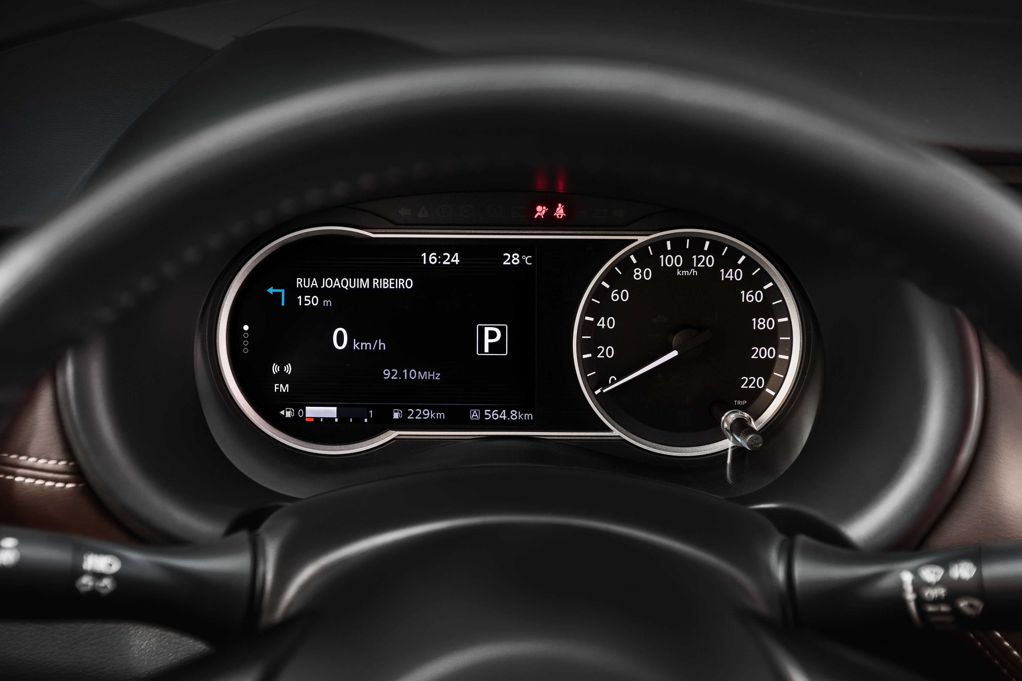 Espaçosa, a cabine é simples e elegante ao mesm o tempo, principalmente pelo painel limpo e despojado, que traz a última proposta da Nissan para esse componente, que remete a uma asa delta. Bem posicionados estão os mostradores. Na direita fica o velocímetro, mas na esquerda há uma tela digital, onde é possivel visualizar o contagiros ou navegar entre 12 telas disponíveis, que mostram as informações de funções como computador de bordo, configurações