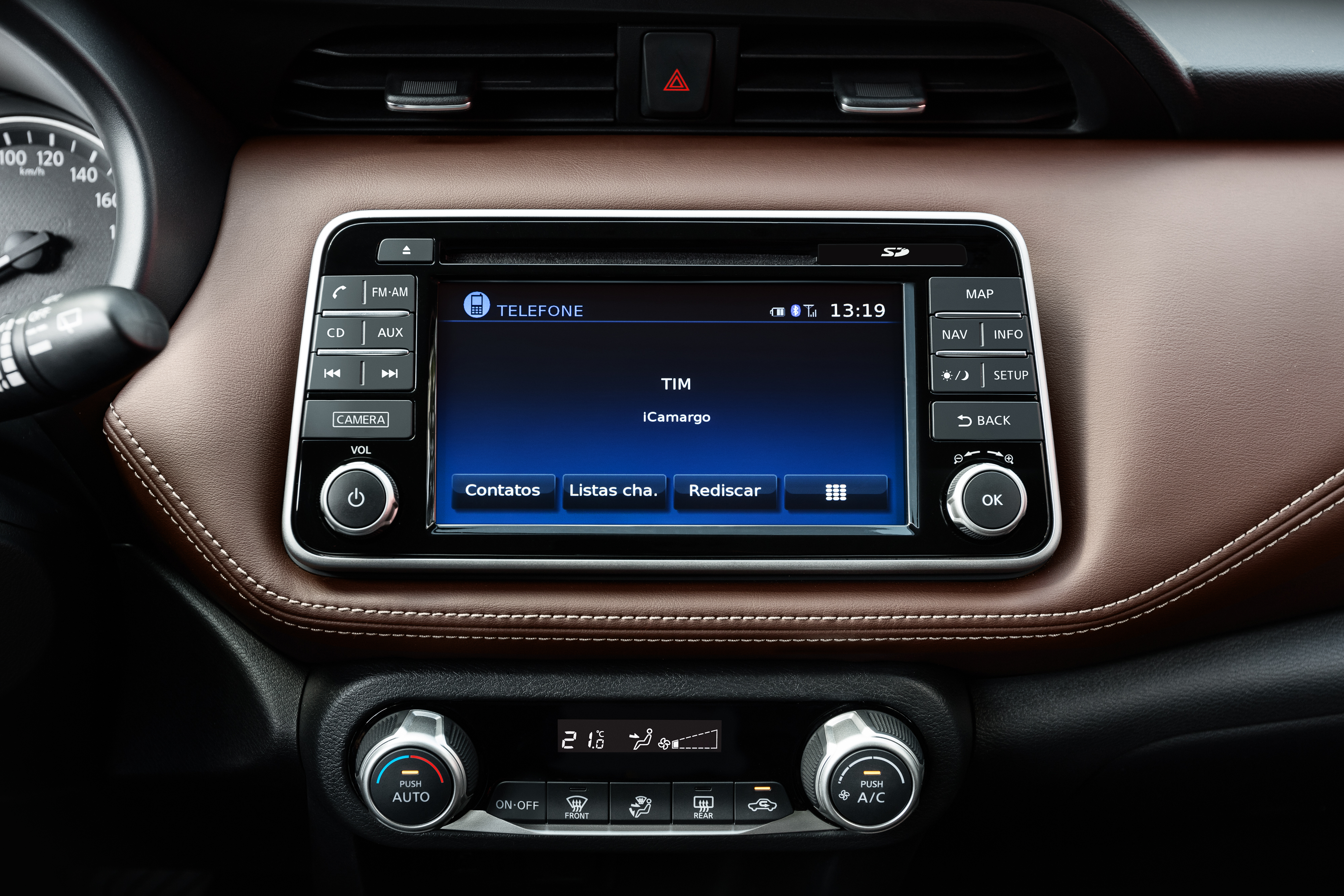 Abaixo deste display estão posicionados os controles do sistema de aquecimento e ventilação, que conta com ar-condicionado automático, com desenho simples e intuitivo.