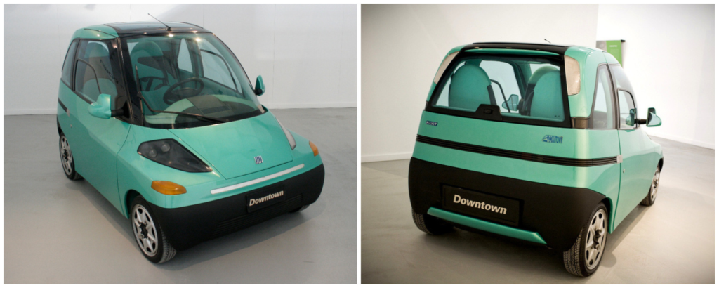 Na imagem acima, na busca pelo carro elétrico urbano, em 1993 a FIAT trouxe o Downtown, carro com um formato mais incomum que o do Multipla, mas com um desenho extremamente inteligente e três lugares, com autonomia de quase 190 km em ciclo urbano. Foi mais uma tentativa da marca italiana de eletrificar sua frota, que já havia mostrado o Panda Elettra (abaixo) em 1990.