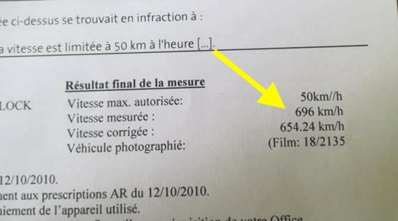 Aconteceu na Bélgica. A multa por excesso de velocidade da imagem é real, mas o valor de velocidade indicado está -é claro- errado. Na verdade, o motorista belga em questão foi apanhado por um radar a 60 km/h, numa área de 50 km/h. A velocidade de 696 km/h parece bem distante da realidade, e até aqui dá para rir da situação. Pelo menos até descobrir o valor da multa: cerca de US$ 8 mil.