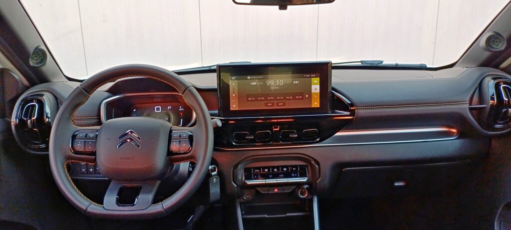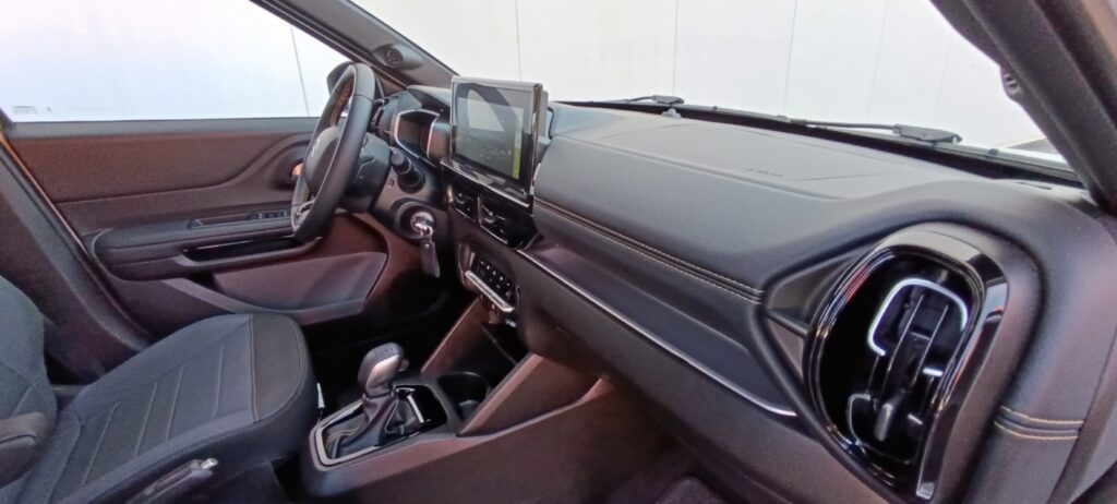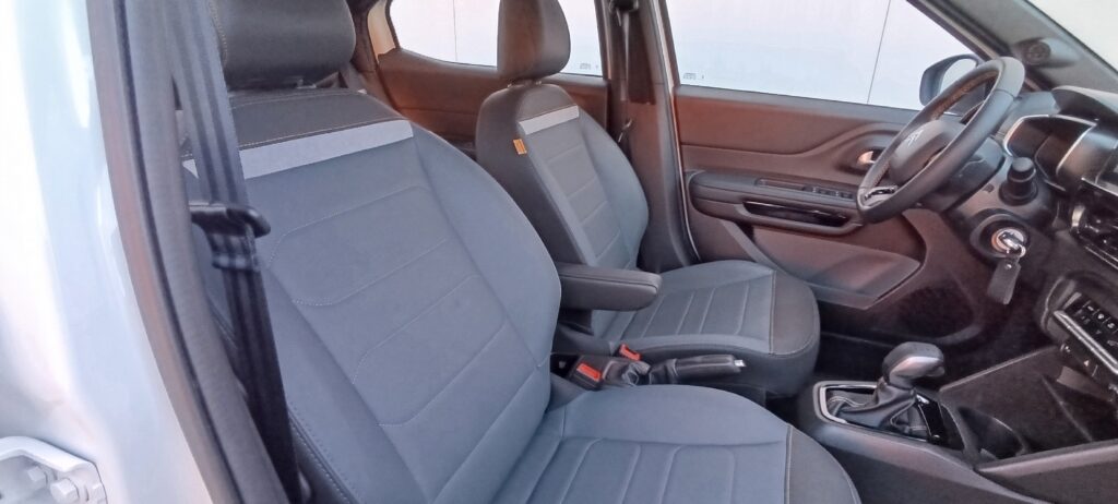 A versão Shine traz um “pacote” de recursos e equipamentos bastante equilibrado: central multimídia com tela de 10 polegadas e com espelhamento de smartphone sem fio; painel digital de sete polegadas; ar-condicionado digital; bancos revestidos de material sintético que imita couro; quatro airbags; controle de tração/estabilidade e acabamento bem cuidado, sem ser luxuoso. A proposta dos Basalt é clara: oferecer o essencial com boa usabilidade, evitando itens supérfluos que elevem o custo final.