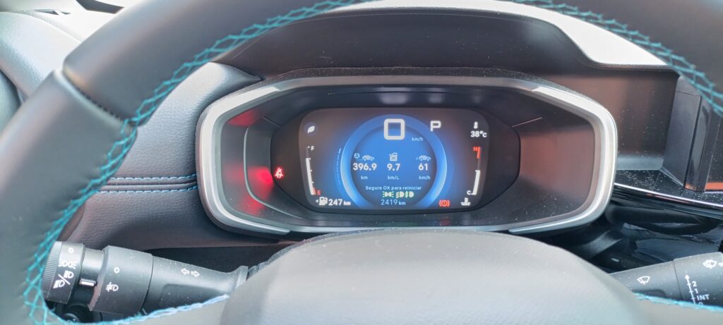 Um ponto negativo do YOU! era o quadro digital de instrumentos, então muito simples, já visto nos outros níveis de acabamento do modelo. Agora a marca resolveu isso. Como imaginar um carro com motor turbo sem o necessário conta-giros? O painel de instrumentos do Citroën C3 YOU! 2026 é digital de sete polegadas (TFT), e exibe informações como conta-giros, econômetro, temperatura, pressão dos pneus, computador de bordo e modo de condução, com iluminação azul e botões de menu junto ao volante.