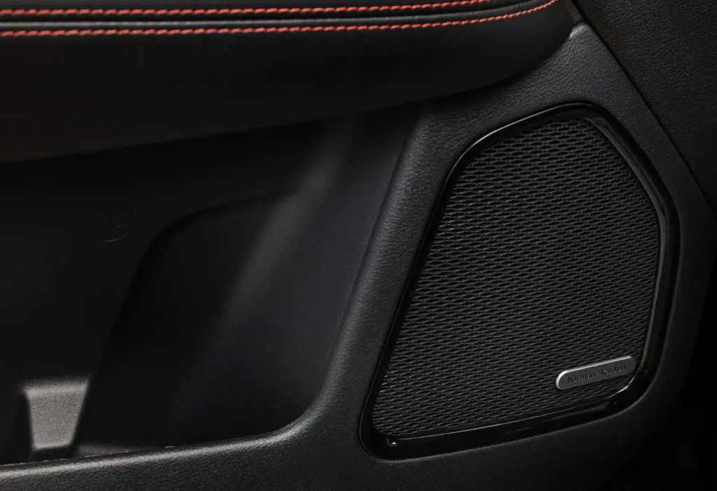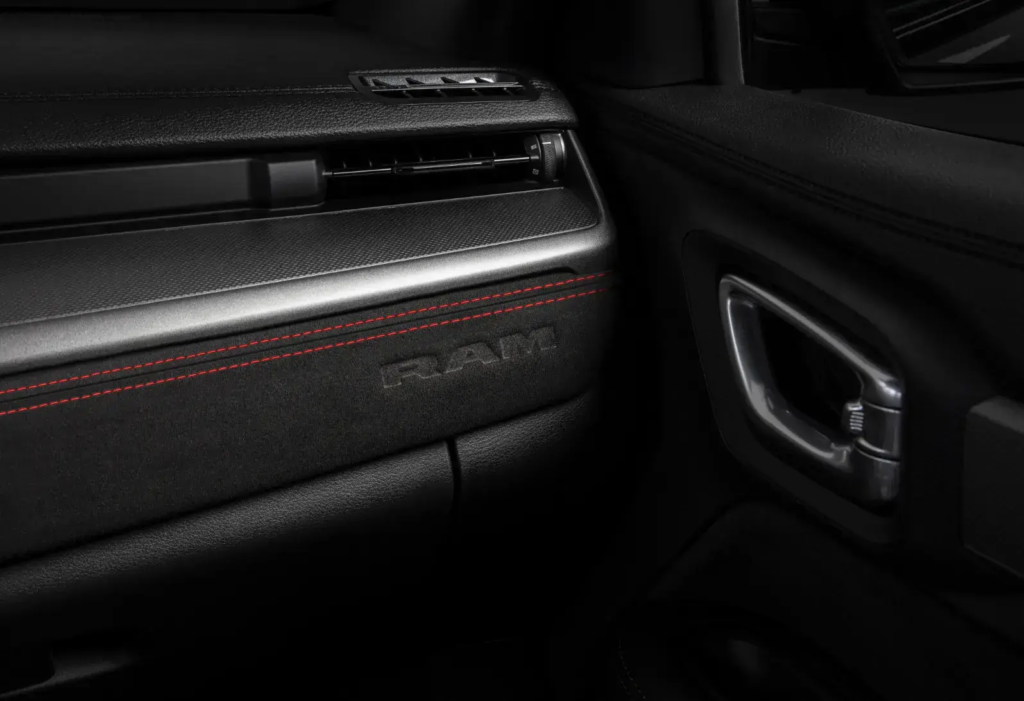 Por dentro, a Rampage R/T confirma o seu posicionamento de veículo mais sofisticado da linha e mata de inveja as demais picapes nacionais. O acabamento utiliza materiais de boa qualidade, com destaque para: revestimentos em material sintético que imitam couro e camurça com costuras em vermelho, painel digital configurável, central multimídia vertical de grandes dimensões e som premium Harman Kardon com 10 alto-falantes e subwoofer.